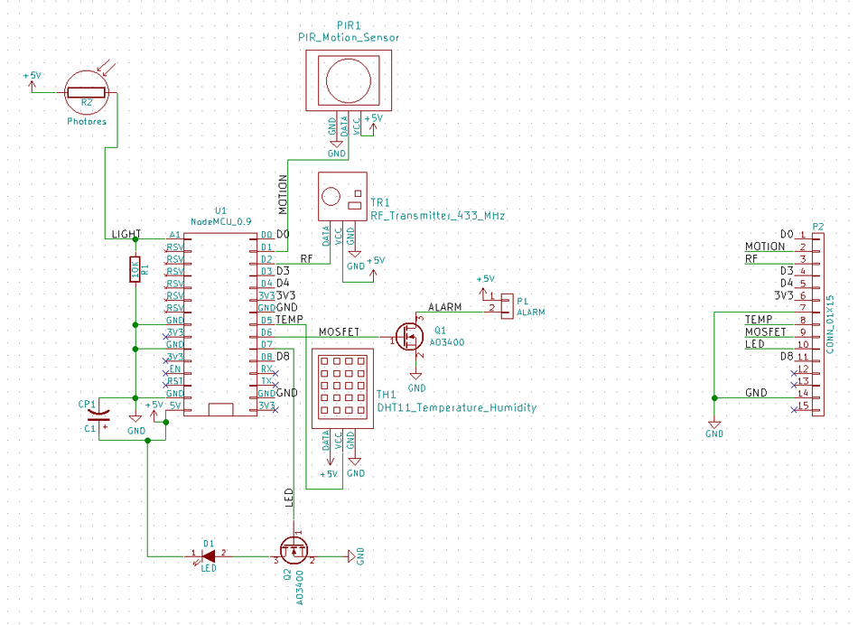Since this is a home sensor circuit, I wanted the sensors to be relevant to a home scenario, and easy to get on eBay. The ones that fit that bill were a temperature and humidity sensor (DHT22, about $3), a pyroelectric motion sensor (about $1), and a photoresistor (a device that can sense the amount of ambient light, about $0.03).