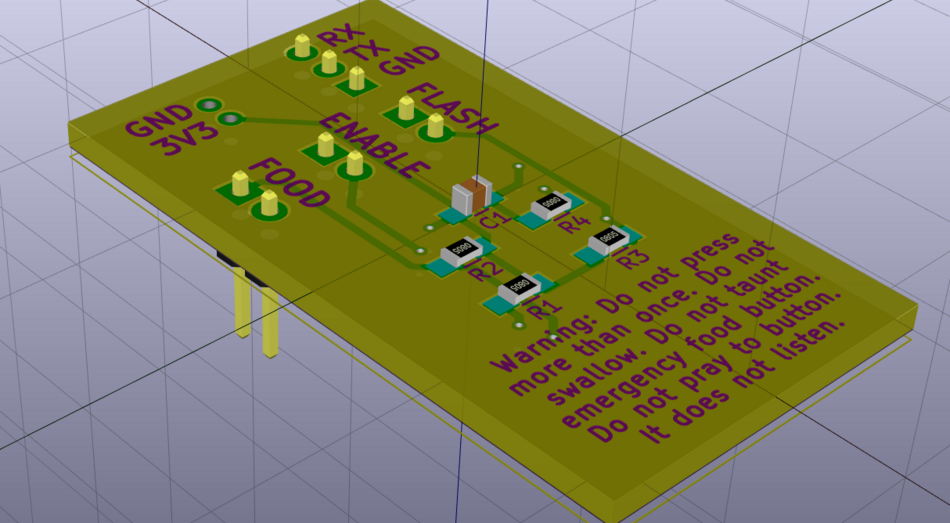 Of course, the eagle-eyed reader may notice that the breadboard above is slightly larger than the button, and that we might have some difficulty fitting the former into the latter. Thus, we must do something nobody has done before: Design and manufacture a PCB!1