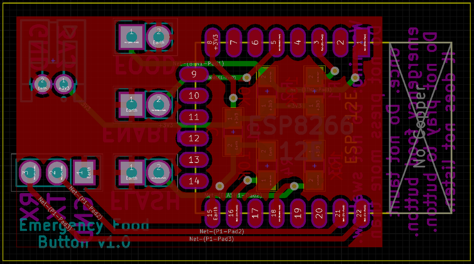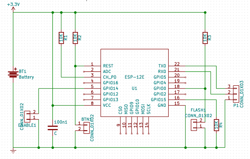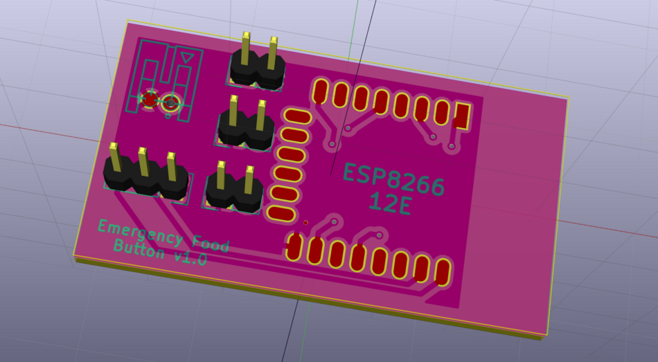 The general design of the emergency food button (hereafter EFB for short) is this: Everything is only there so the ESP can boot, except that there’s an additional button (hereafter referred to as “the button”) that momentarily connects the reset GPIO to the ground when pressed, and resets the ESP.