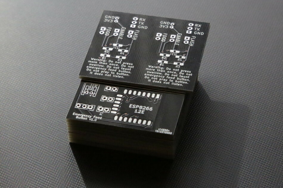 The astute reader will notice (I always try extra hard to notice things when I read that sentence somewhere, so consider yourself outed) that this design means that the EFB will ALWAYS order food when it wakes up, regardless of whether we pressed the button or not (for example, when we change the battery). That potentially fattening downside is why the “enable” switch exists. Short that jumper, and the ESP will order food when booting, leave it open and it will never order anything.