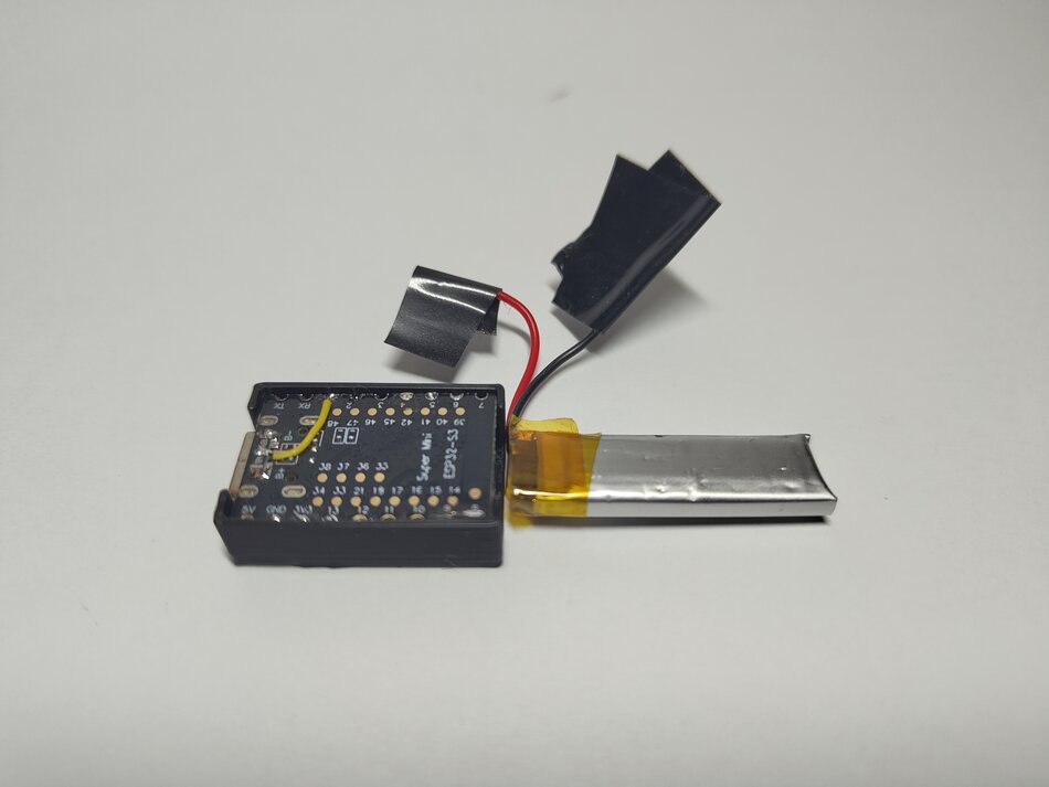 I also had a very thin LiPo battery, which would suit very well. For the final device I’d want a battery that’s a tiny bit shorter, as this one was around 40% longer than the ESP32, but it would do great for now.