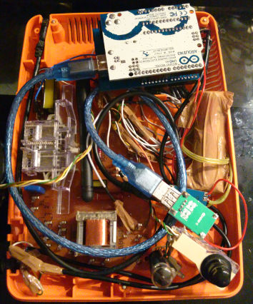 The internals, hooked up to completion.The project was finally done! After some cabling and general making-things-fit-in-places-they-weren’t-meant-to, the phone’s shell can be closed again with everything fitting snuggly inside it, as long as you don’t shake it too hard.