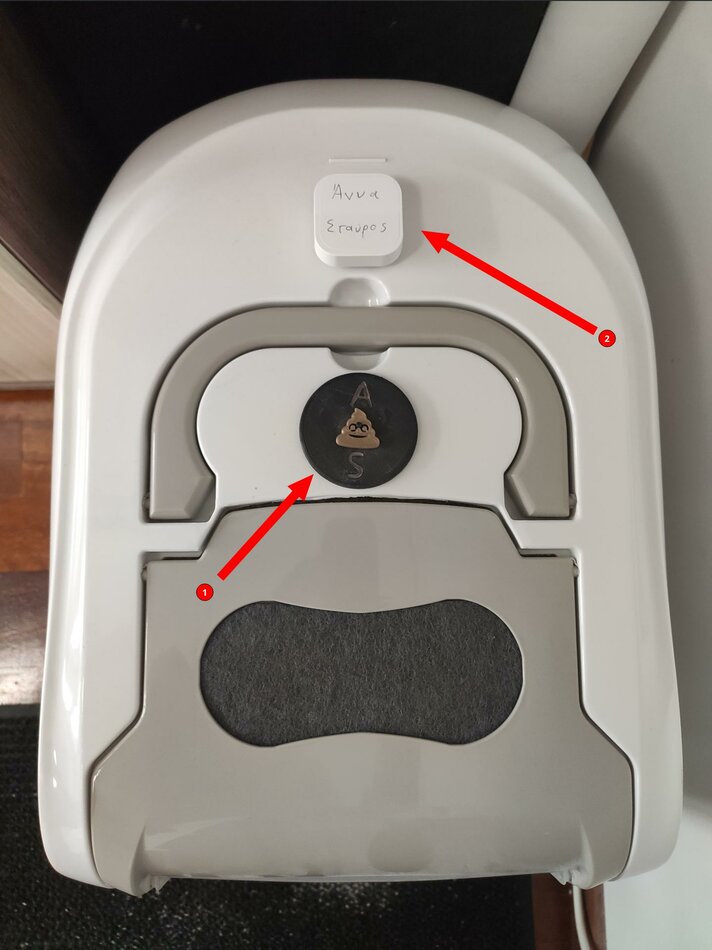 I put some stickers with our names over those bits, and now there’s a button for me and one for my partner, to press after we’ve cleaned the litter.