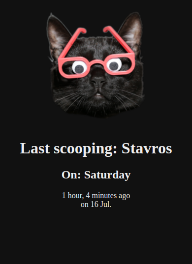 On the other side lives a very simple Django app, with a daemon that listens to MQTT messages. When the daemon receives the MQTT message above, it adds an entry to a database table that indicates that one of us cleaned the litter, along with a timestamp.