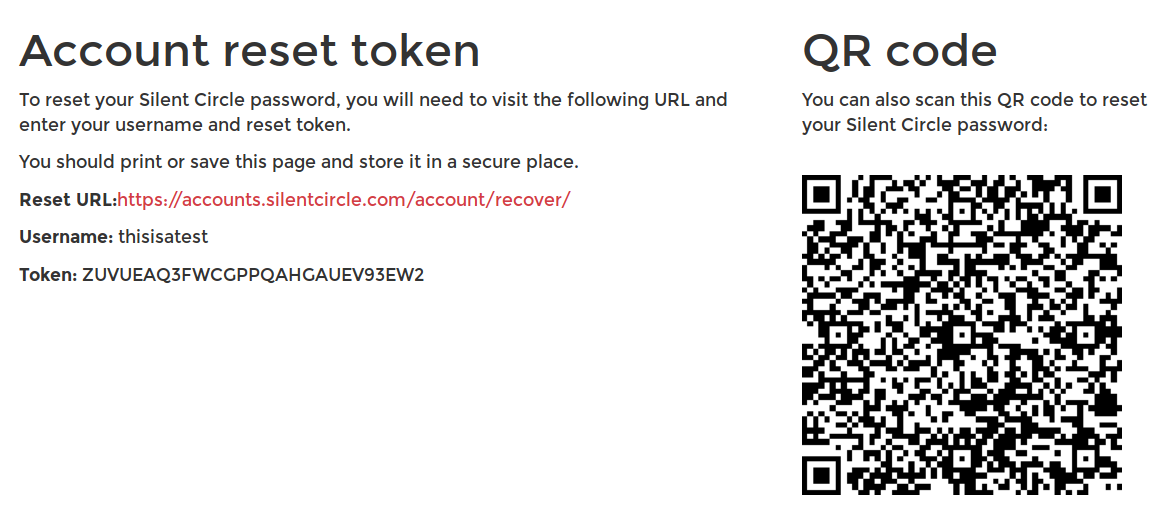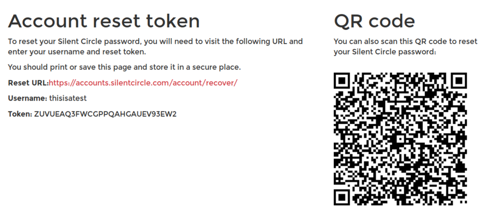 However, at Silent Circle, we added a second way to allow prudent users to recover their account: A long, random, single-use recovery key. This key is on a dedicated, printable page, along with a QR code that will immediately take the user to a “password reset” page and disable 2FA on the account.