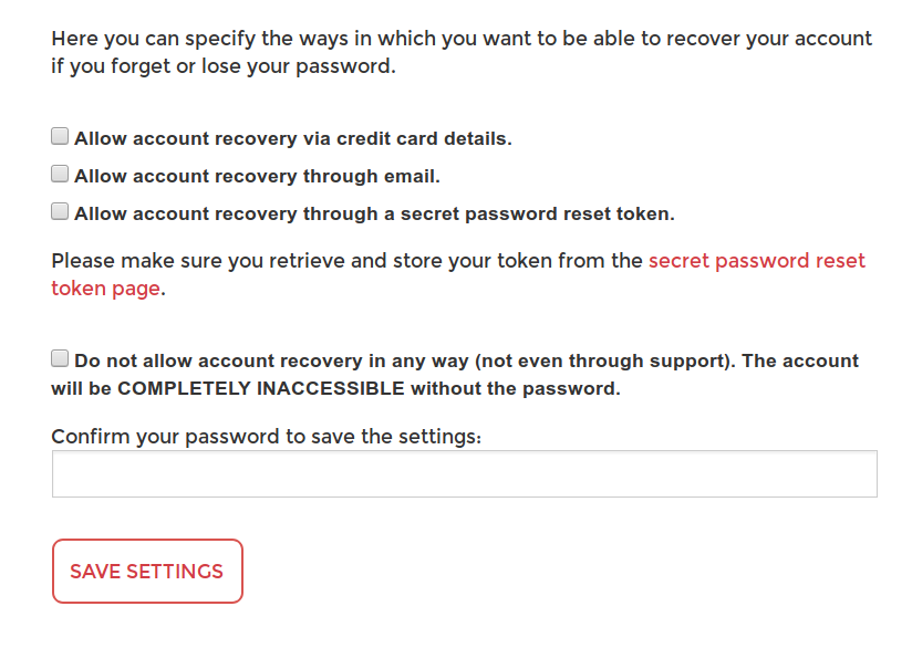 The user indicates that they have stored this key safely by clicking a button, and the code is not shown any more. This way, if a user’s account is compromised and the attacker locks the user out, the user can still use the printed page to reset their account, change their password and add two-factor auth to make the account more secure.